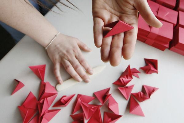 But it's something else to cut 100,000 squares of origami paper _ folding them until her hands ache, packing them by the hundreds to mail to collaborators around the country, making multiple trips to the post office because the boxes won't fit in her car _ to see the returned packages, filled with triangular units, pile up along a wall, a mounting presence in her Cobbs Creek home.