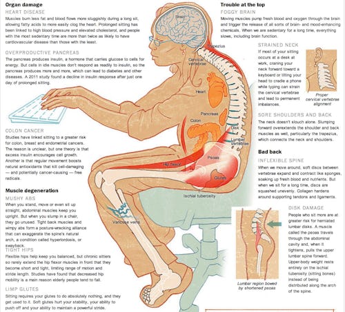 It's giving you diabetes. The Australian Diabetes, Obesity and Lifestyle Study, a mammoth study cataloging the health and fitness habits of 12,000 Australians, found that people with the "highest sedentary behavior" had a 112% increase in their relative risk of Type 2 diabetes, and that was only with four hours of watching television per day. A similar study of more than 4,000 civil servants found that those who spend less than 12 hours sitting down a week can decrease their risk of diabetes by 75%, and that those who sit more than 25 hours per week increase the chance developing metabolic risk factors like "bad" cholesterol and insulin resistance.