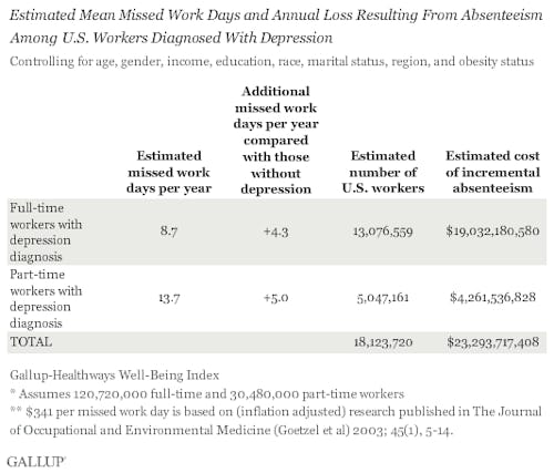It's making us depressed. According to researchers at University College in London, stressful work conditions, including long work hours, can double your risk of depression. A Gallup poll of nearly 240,000 full-time workers found that 10.8% of U.S. full-time workers have received a depression diagnosis. For employers, the truly damning result of the study was the calculation of how much depression costs them: roughly $23 billion a year.