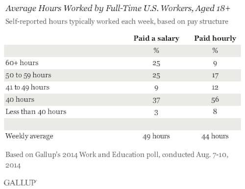Unfortunately for American workers, the average employee's "40-hour workweek" is actually 47 hours, according to Gallup. It's even worse for salaried employees, most of whom aren't eligible for overtime pay. The average non-hourly American worker spends 49 hours per week at the office — with 1 in 4 reporting that they spend more than 60 hours per week at work. That's a 12-hour shift every day, Monday through Friday.