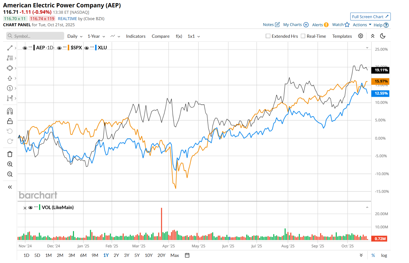 Shares of AEP have rallied 16.5% over the past 52 weeks, outperforming both the S&P 500 Index's ($SPX) 15.2% return and the Utilities Select Sector SPDR Fund’s (XLU) 10.7% rise over the same time frame.