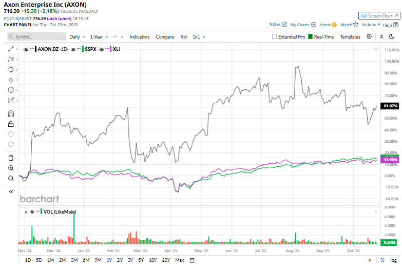 Shares of Axon Enterprise have surged 61.8% over the past 52 weeks, significantly outperforming the broader S&P 500 Index's ($SPX) 16.2% return and the Industrial Select Sector SPDR Fund's (XLI) 13.2% gain over the same period.