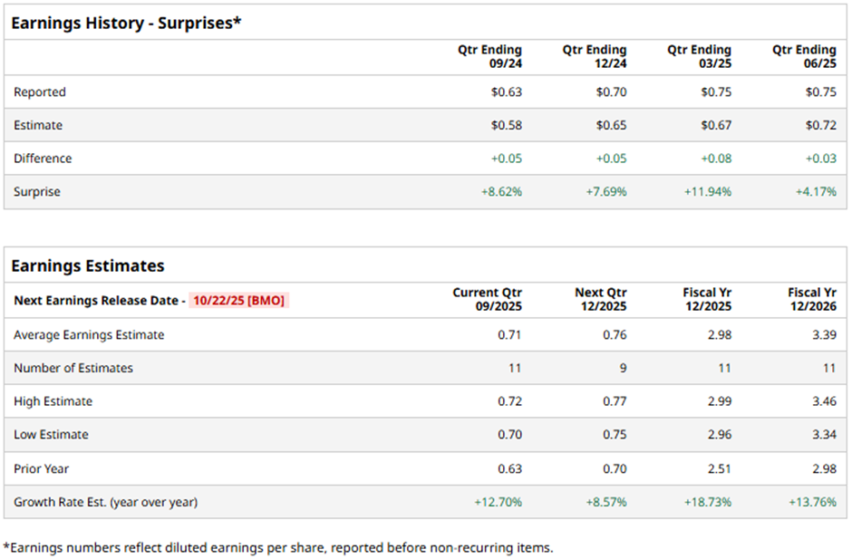 The Marlborough, Massachusetts-based company is slated to announce its fiscal Q3 2025 earnings results before the market opens on Wednesday, Oct. 22. Ahead of the event, analysts expect Boston Scientific to report an adjusted EPS of $0.71, up 12.7% from $0.63 in the year-ago quarter. It has surpassed Wall Street's bottom-line estimates in the past four quarterly reports.
