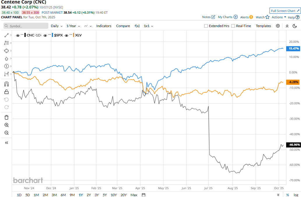 CNC stock prices have plummeted 46.3% over the past 52 weeks, notably underperforming the Health Care Select Sector SPDR Fund’s (XLV) 4.5% dip and the S&P 500 Index’s ($SPX) 17.9% surge during the same time frame.