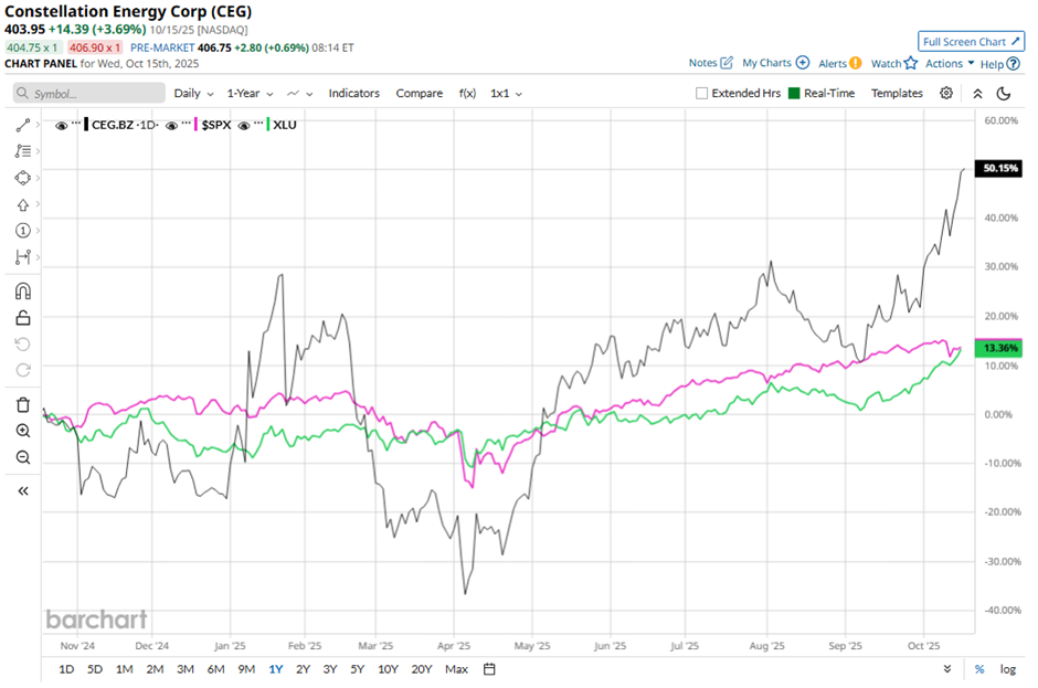 Shares of Constellation Energy have jumped 51.8% over the past 52 weeks, exceeding the broader S&P 500 Index's ($SPX) 14.7% return and the Utilities Select Sector SPDR Fund's (XLU) 15.3% gain over the same period.