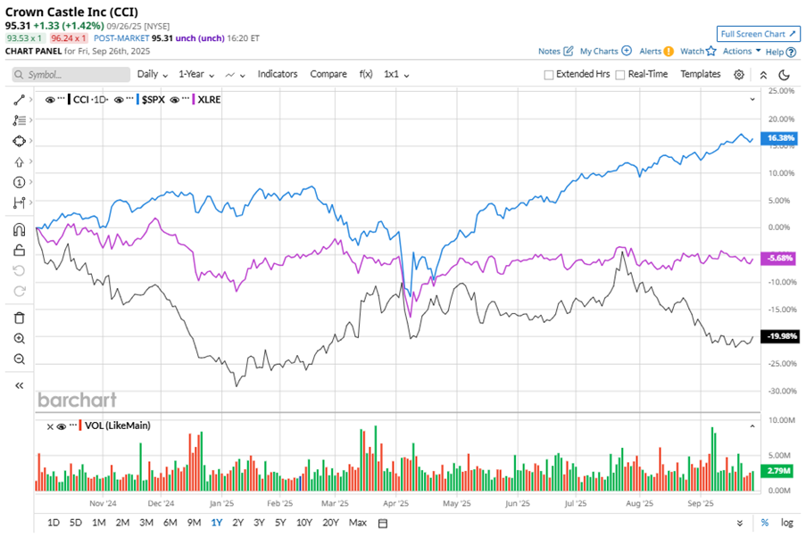 CCI stock has considerably underperformed the S&P 500 Index’s ($SPX) 15.6% gains over the past 52 weeks, with shares down 17% during this period. Similarly, it underperformed the Real Estate Select Sector SPDR Fund’s (XLRE) 5.3% downtick over the same time frame.