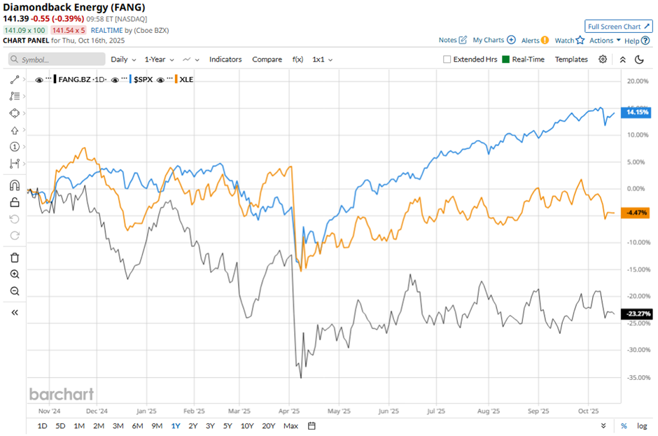 FANG stock has fallen 21.8% over the past 52 weeks, lagging behind both the S&P 500 Index's ($SPX) 14.6% gain and the Energy Select Sector SPDR Fund's (XLE) 4.3% decline over the same period.