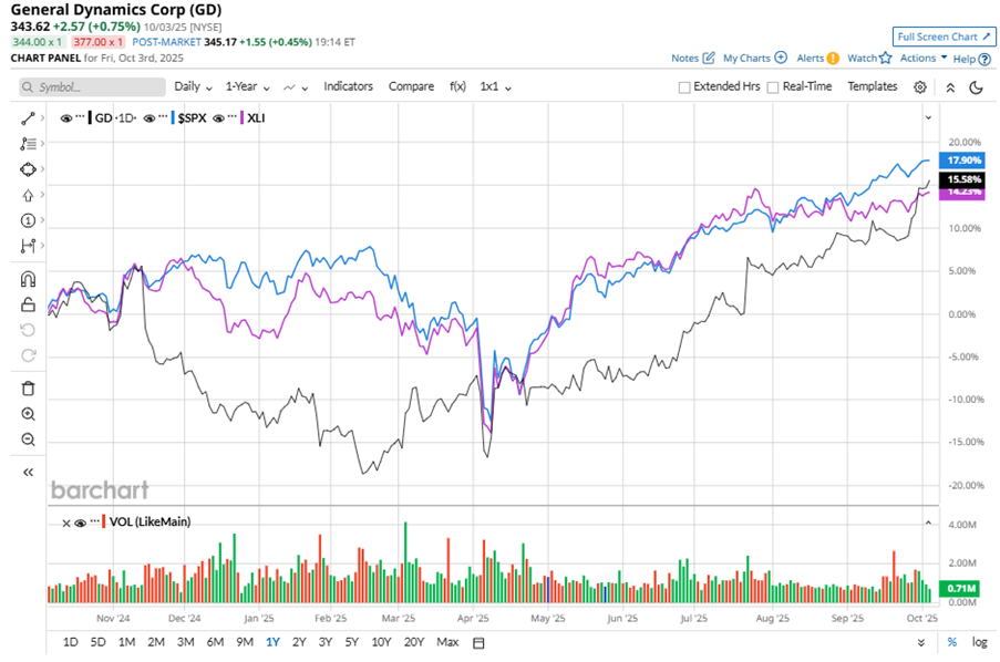 GD stock has underperformed the S&P 500 Index’s ($SPX) 17.8% gains over the past 52 weeks, with shares up 14.7% during this period. Meanwhile, it aligned with the Industrial Select Sector SPDR Fund’s (XLI) 14.7% gains over the same time frame.