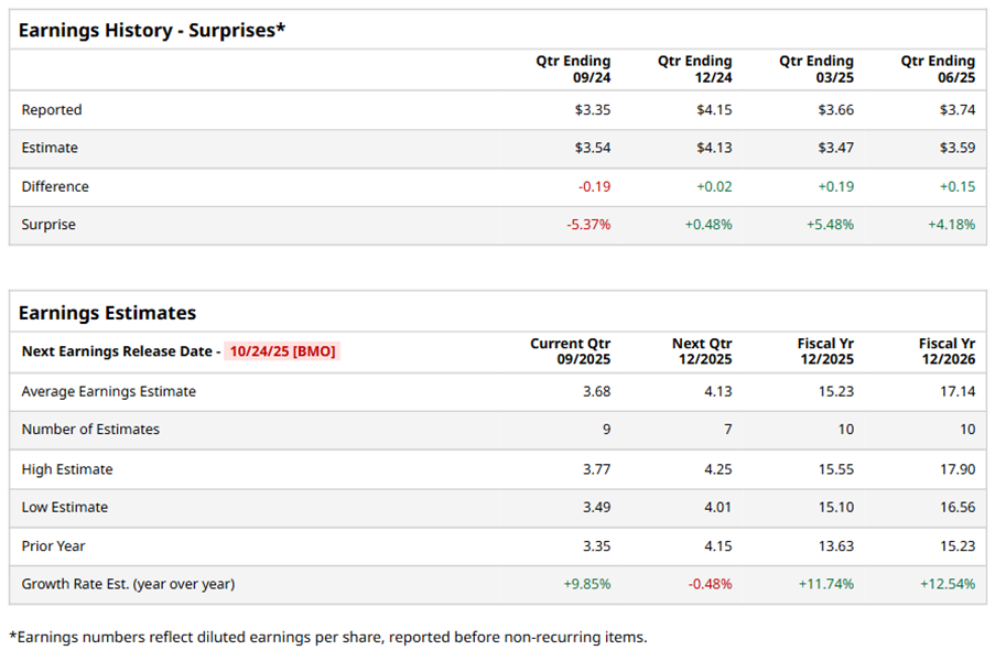 General Dynamics Corporation (GD), headquartered in Reston, Virginia, operates as a global aerospace and defense company. Valued at $92.4 billion by market cap, the company offers a broad portfolio of products and services in business aviation, combat vehicles, weapons systems, munitions, shipbuilding design and construction, information systems, and technologies. The defense giant is expected to announce its fiscal third-quarter earnings for 2025 before the market opens on Friday, Oct. 24.