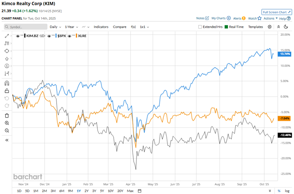 KIM stock has fallen 8.6% over the past 52 weeks, lagging behind the broader S&P 500 Index's ($SPX) 13.4% increase and the Real Estate Select Sector SPDR Fund's (XLRE) 5.6% decrease over the same time frame.