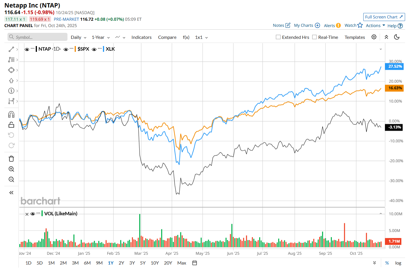 NetApp has declined 1.9% over the past 52 weeks, considerably underperforming both the S&P 500 Index's ($SPX) 18.4% return and the Technology Select Sector SPDR Fund’s (XLK) 29.8% uptick over the same time frame.