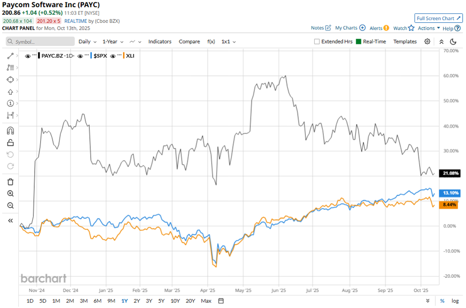 PAYC stock has soared 23.3% over the past 52 weeks, outperforming the broader S&P 500 Index's ($SPX) 14.1% return and the Industrial Select Sector SPDR Fund's (XLI) 9.2% gain over the same period.