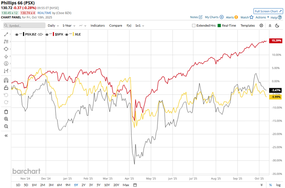 Shares of Phillips 66 have decreased 4.5% over the past 52 weeks, underperforming both the S&P 500 Index's ($SPX) 16.7% gain. Nevertheless, the stock has shown a slightly less pronounced decline than the Energy Select Sector SPDR Fund's (XLE) 5.4% drop over the same period.