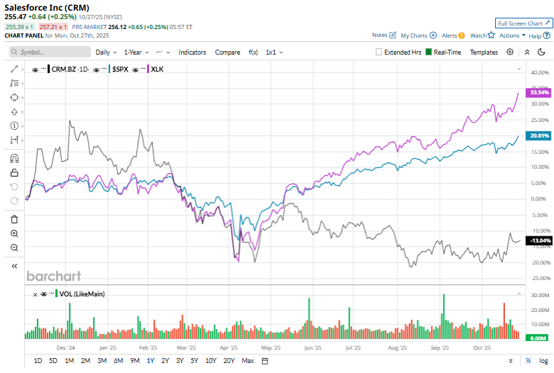 Shares of Salesforce have dropped 12.1% over the past 52 weeks, struggling to keep up with the broader S&P 500 Index's ($SPX) 18.4% gain and the Technology Select Sector SPDR Fund's (XLK) 29.8% return over the same period.