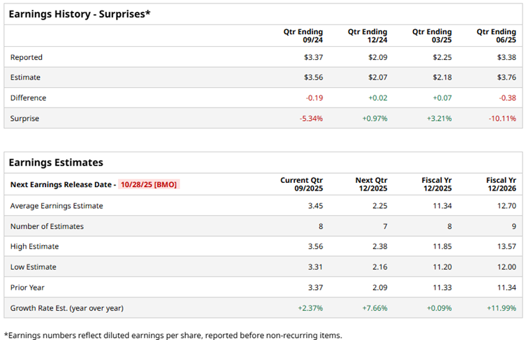 Sherwin-Williams is set to report its third-quarter results on Tuesday, Oct. 28, 2025, before the market opens. Ahead of the results, Wall Street analysts expect modest growth in its bottom line. For the third quarter, analysts expect the company’s profit to grow by 2.4% year-over-year (YOY) to $3.45 per diluted share. It has a mixed history of surpassing consensus estimates, topping them on two of the last four occasions and missing them on two instances.