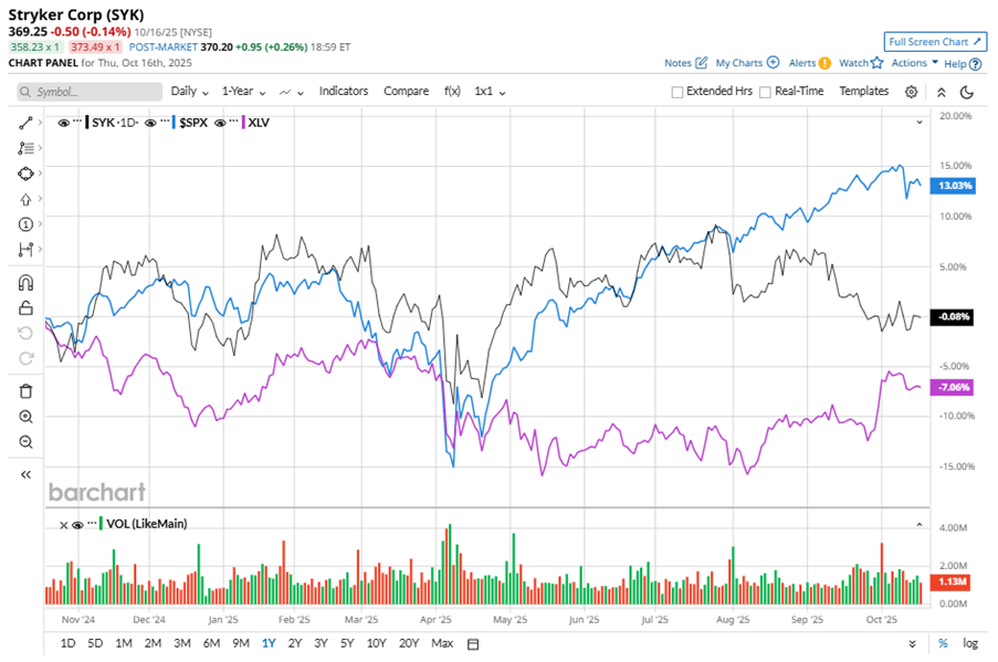 SYK stock has underperformed the S&P 500 Index’s ($SPX) 13.5% gains over the past 52 weeks, with shares up 2.2% during this period. Similarly, it underperformed the Health Care Select Sector SPDR Fund’s (XLV) 7.2% losses over the same time frame.