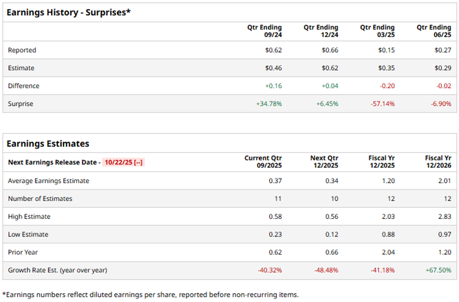 Analysts expect the Austin, Texas-based company to report an EPS of $0.37 in Q3 2025, a 40.3% decrease from $0.62 in the year-ago quarter. It has exceeded Wall Street's earnings estimates in two of the last four quarters while missing on two other occasions.