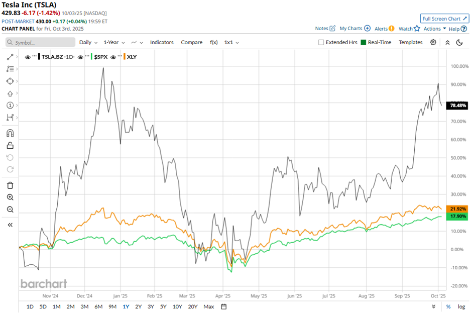 Shares of Tesla have jumped 78.6% over the past 52 weeks, significantly outperforming both the S&P 500 Index's ($SPX) 17.8% return and the Consumer Discretionary Select Sector SPDR Fund's (XLY) 21.6% increase over the period.