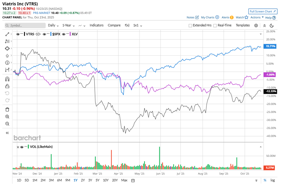 VTRS stock has underperformed the S&P 500 Index’s ($SPX) 16.2% gains over the past 52 weeks, with shares down 10.7% during this period. Similarly, it underperformed the Health Care Select Sector SPDR Fund’s (XLV) 2.9% dip over the same time frame.