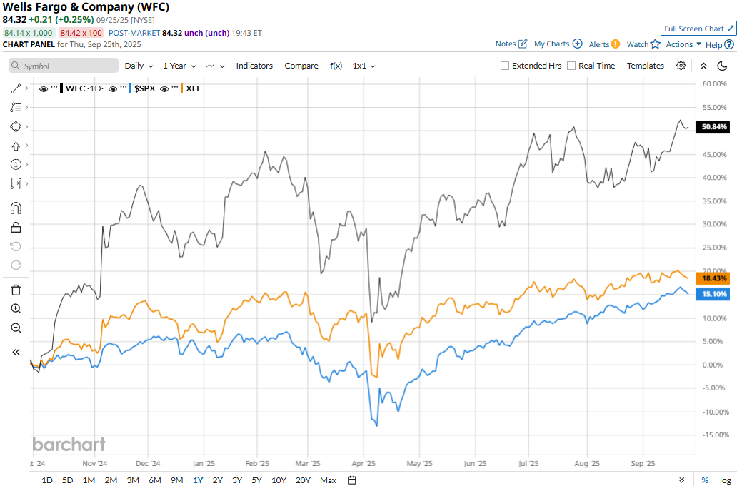 WFC’s stock prices have surged 57.3% over the past 52 weeks, substantially outpacing the S&P 500 Index’s ($SPX) 15.4% gains and the Financial Select Sector SPDR Fund’s (XLF) 19.4% returns during the same time frame.