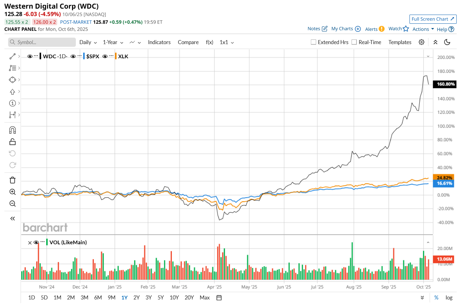 On Sep. 29, shares of Western Digital surged 9.2% and maintained this upward momentum over the next four trading sessions, after several investment banks, including Morgan Stanley (MS) and Rosenblatt Securities, sharply raised their price targets on the stock. The upgrades reflected a strengthening market for hard disk drives (HDDs) amidst rising data storage demand, fueled by expanding cloud infrastructure spending and accelerating AI-related investments.