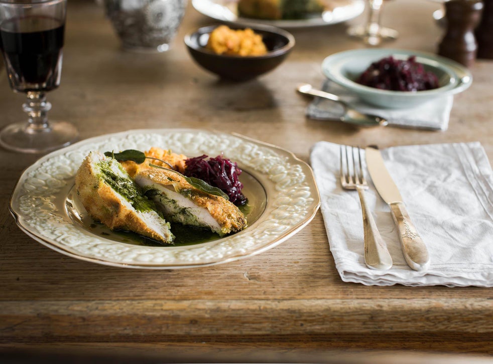 Pheasant Kiev with cavolo nero garlic butter, mulled red cabbage and crushed carrot and swede