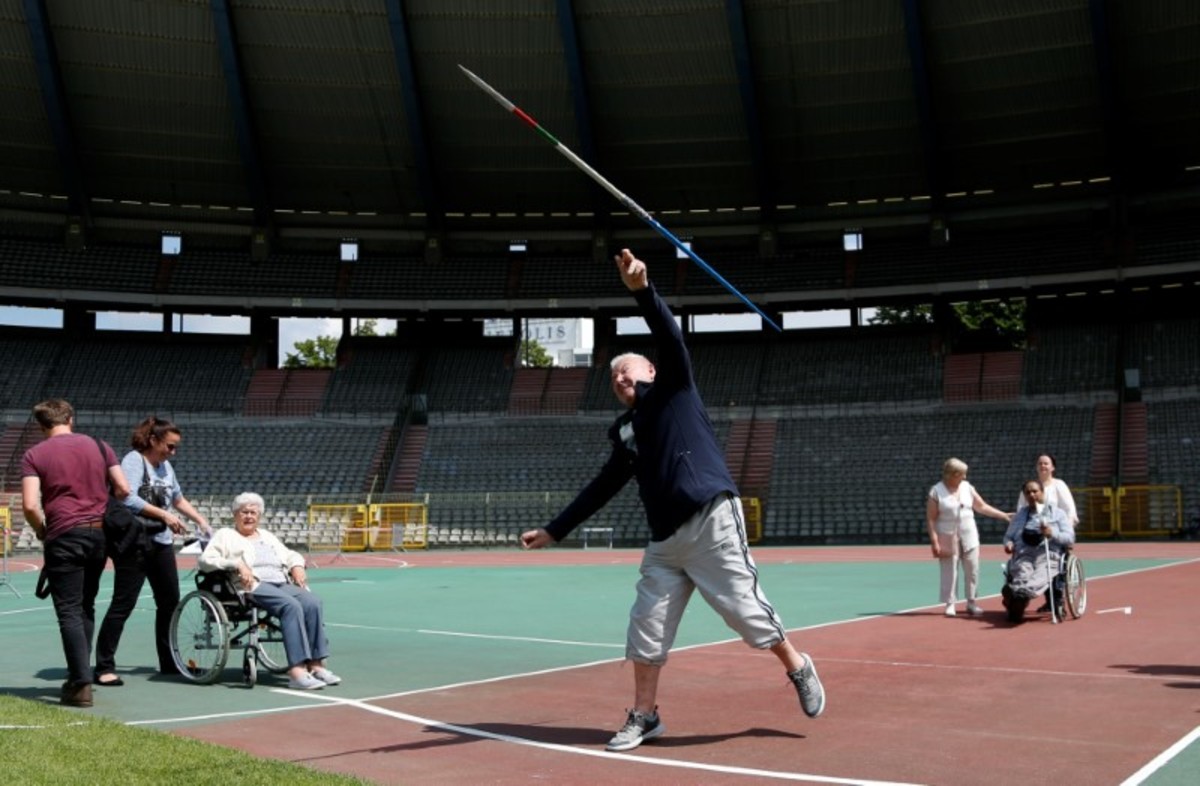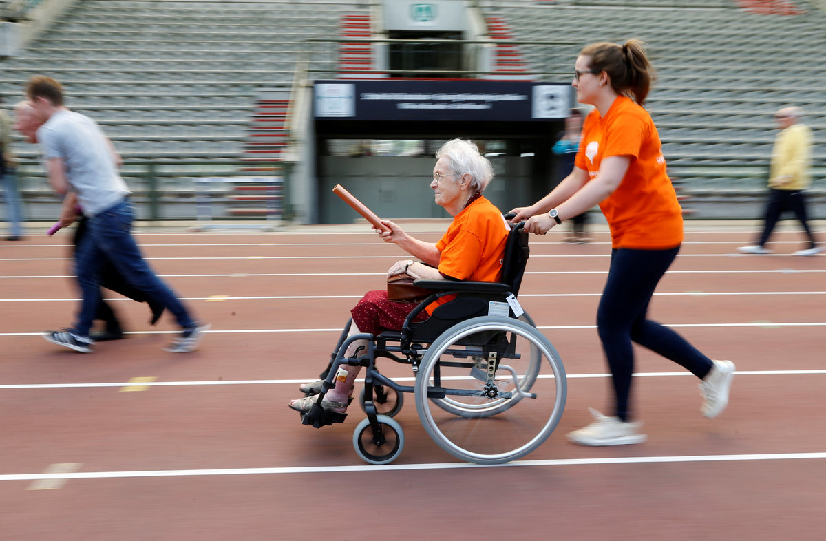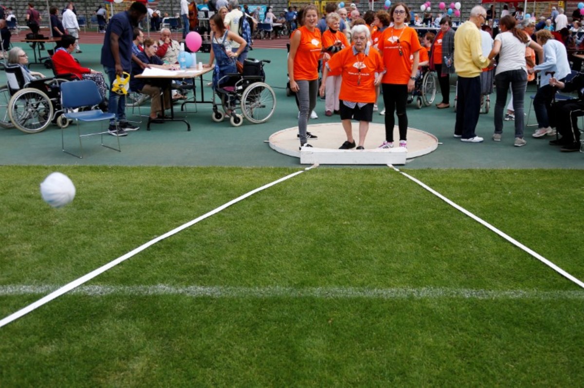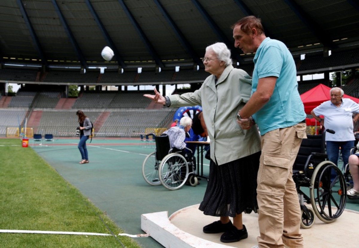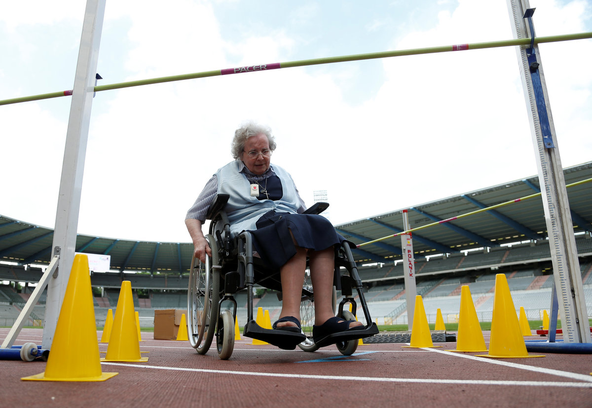 A participant takes part in the 4x25 metres relay during the "Olympics for Seniors" event at King Baudouin stadium in Brussels, Belgium June 13, 2017. REUTERS/Francois LenoirA participant is pushed by an assistant as they take part in the 4x25 metres relay during the "Olympics for Seniors" event at King Baudouin stadium in Brussels, Belgium June 13, 2017. REUTERS/Francois LenoirA participant takes part in the wool ball shot put event during the "Olympics for Seniors" at King Baudouin stadium in Brussels, Belgium June 13, 2017. REUTERS/Francois Lenoir A participant takes part in the javelin throw event during the "Olympics for Seniors" at King Baudouin stadium in Brussels, Belgium June 13, 2017. REUTERS/Francois LenoirA participant is pushed by an assistant as they take part in the 4x25 metres relay during the "Olympics for Seniors" event at King Baudouin stadium in Brussels, Belgium June 13, 2017. REUTERS/Francois LenoirA participant takes part in the wool ball shot put event during the "Olympics for Seniors" at King Baudouin stadium in Brussels, Belgium June 13, 2017. REUTERS/Francois LenoirParticipants are pushed by assistants as they take part in the 4x25 metres relay during the "Olympics for Seniors" event at King Baudouin stadium in Brussels, Belgium June 13, 2017. REUTERS/Francois LenoirA participant sits in a wheelchair as she takes part in the steeple chase event during the "Olympics for Seniors" at King Baudouin stadium in Brussels, Belgium June 13, 2017. REUTERS/Francois Lenoir