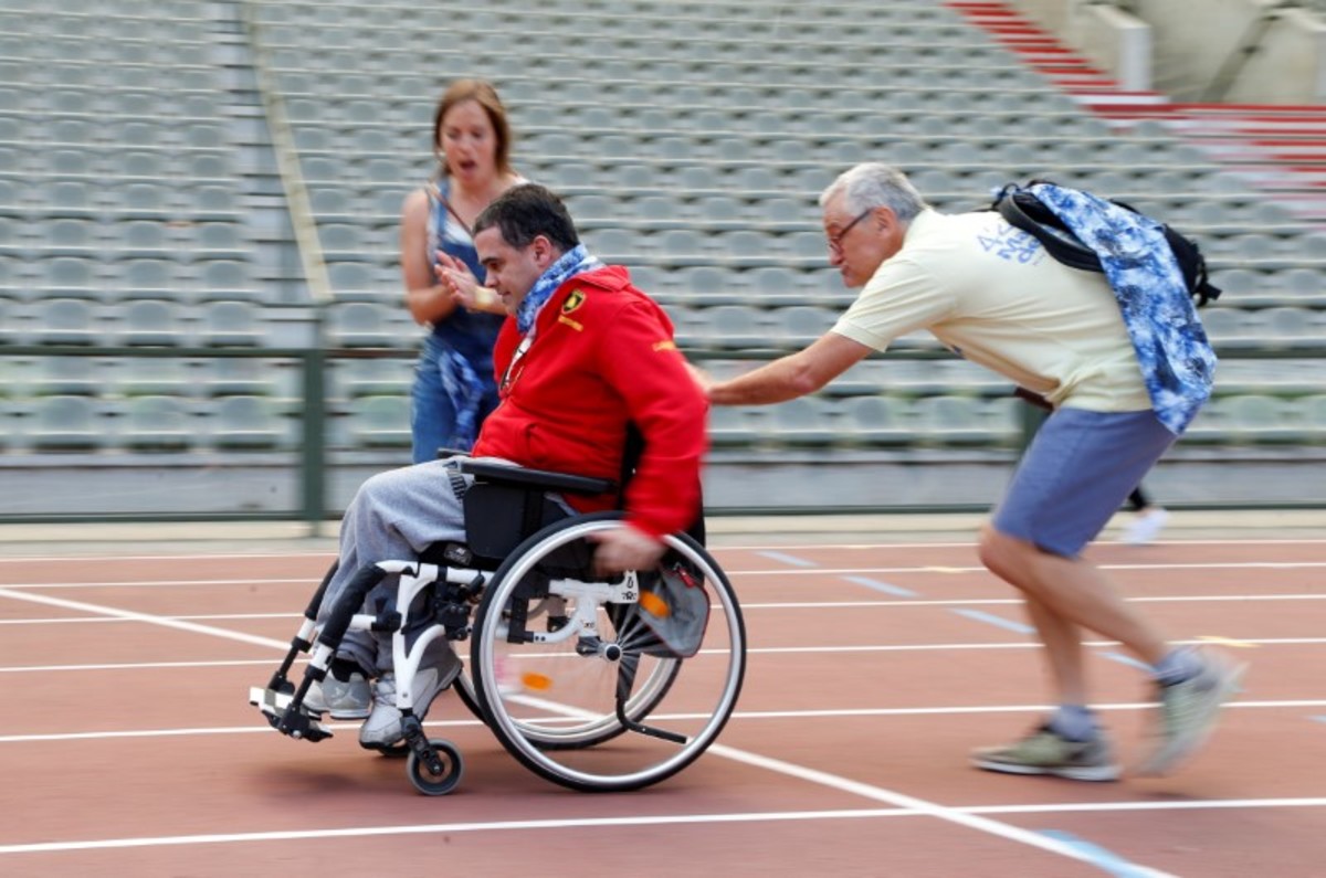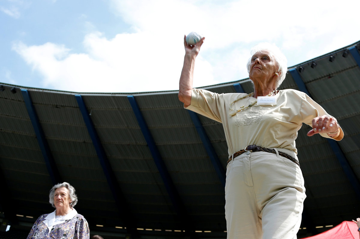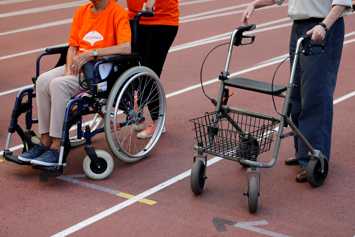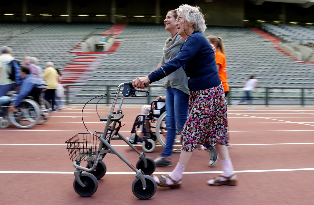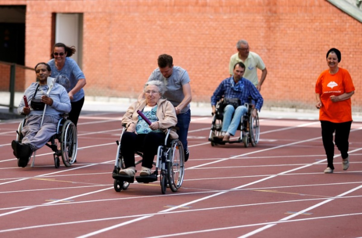 A participant takes part in the 4x25 metres relay during the "Olympics for Seniors" event at King Baudouin stadium in Brussels, Belgium June 13, 2017. REUTERS/Francois LenoirA participant is pushed by an assistant as they take part in the 4x25 metres relay during the "Olympics for Seniors" event at King Baudouin stadium in Brussels, Belgium June 13, 2017. REUTERS/Francois LenoirA participant takes part in the wool ball shot put event during the "Olympics for Seniors" at King Baudouin stadium in Brussels, Belgium June 13, 2017. REUTERS/Francois Lenoir A participant takes part in the javelin throw event during the "Olympics for Seniors" at King Baudouin stadium in Brussels, Belgium June 13, 2017. REUTERS/Francois LenoirA participant is pushed by an assistant as they take part in the 4x25 metres relay during the "Olympics for Seniors" event at King Baudouin stadium in Brussels, Belgium June 13, 2017. REUTERS/Francois LenoirA participant takes part in the wool ball shot put event during the "Olympics for Seniors" at King Baudouin stadium in Brussels, Belgium June 13, 2017. REUTERS/Francois LenoirParticipants are pushed by assistants as they take part in the 4x25 metres relay during the "Olympics for Seniors" event at King Baudouin stadium in Brussels, Belgium June 13, 2017. REUTERS/Francois LenoirA participant sits in a wheelchair as she takes part in the steeple chase event during the "Olympics for Seniors" at King Baudouin stadium in Brussels, Belgium June 13, 2017. REUTERS/Francois Lenoir