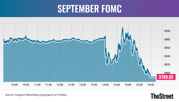 In September, note that the trend holds, but it's the only one of these charts that shows a second sell-off during the day, occurring after Powell's remarks that follow the meeting.