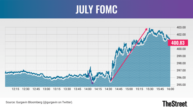 Charting of the SPDR S&P 500 ETF Trust (SPY) shows that each committee meeting involving increased rates precipitates a stock sell-off during the meeting when the announcement is made, followed by a rally in each instance when Federal Reserve Chairman Jerome Powell delivers remarks after the news.