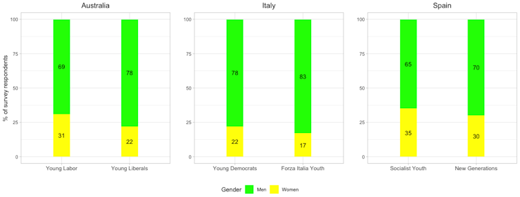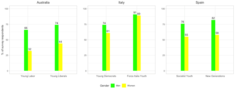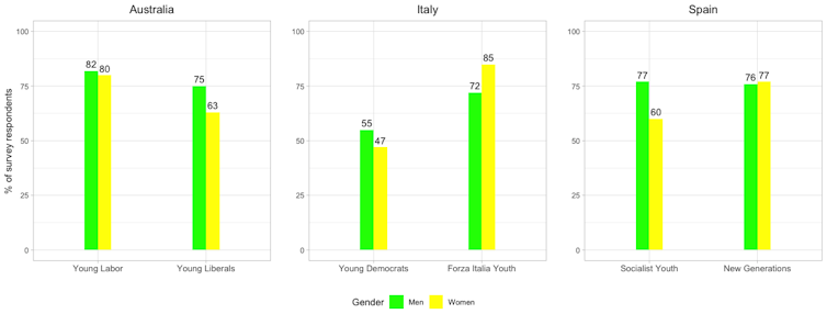 Our findings are based on surveys we conducted of six youth wings – three from the centre-left (Young Labor in Australia, Young Democrats in Italy, Socialist Youth in Spain) and three from the centre-right (Young Liberals in Australia, Forza Italia Youth in Italy, New Generations in Spain).