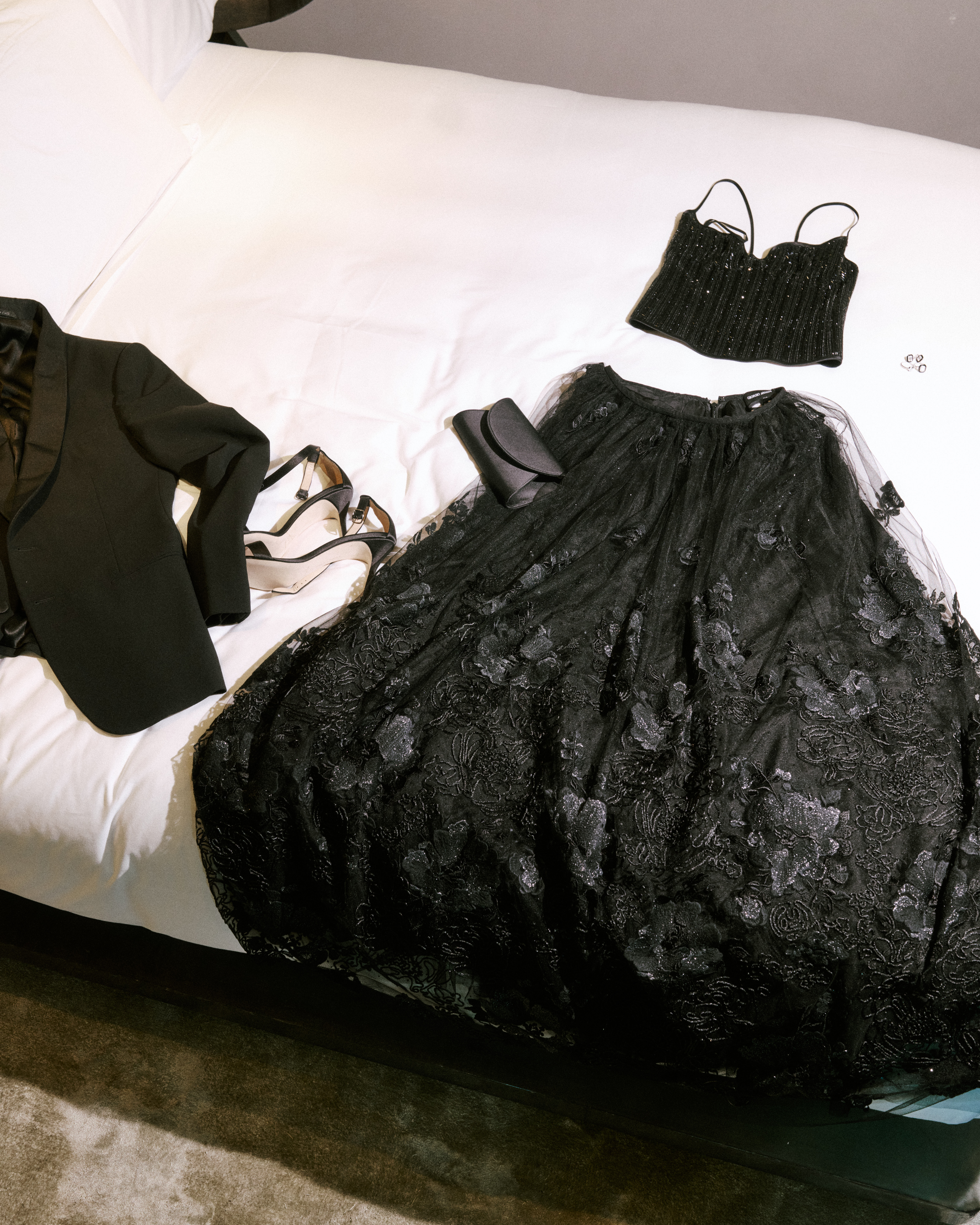 The look she and Williams selected for Giorgio Armani’s Spring 2026 fashion show picked up where those moments left off. They chose a beaded black corset top cinched over a ballgown skirt, swirling with coordinating beaded lace flowers. Alongside her semi-sheer skirt, Bibb added open-toe black sandals and a delicate pearl ring. “Jeanann loved how romantic the skirt was with the floral lace and the movement it had,” Bibb explains. “Then, pairing that with the corset top that fit like a glove just felt like classic Armani to her.”