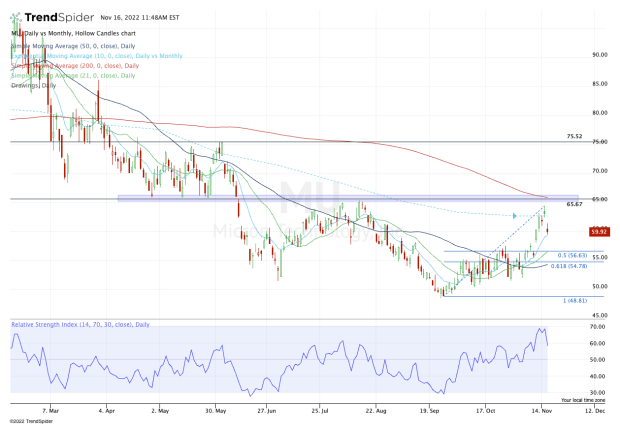 I mention the rally because it gave Micron stock its first close above the 10-month moving average since June. However, Wednesday’s decline has Micron in retreat, now trading just above its 10-day moving average.
