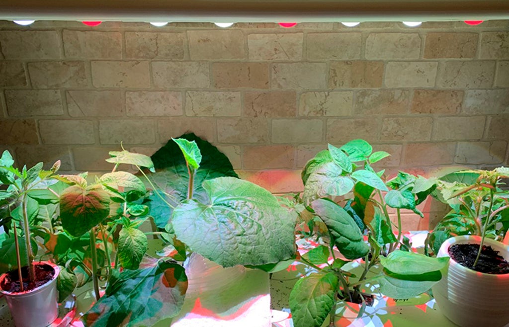 When seedlings poke up, remove the dome or wrap, and place containers by a sunny window, or under fluorescent or LED grow lamps for 14 hours daily. Expensive lamp models aren’t necessary; ordinary shop lights will do. Keep the light source no more than 2-4 inches above the plants, adjusting its height as the seedlings grow.