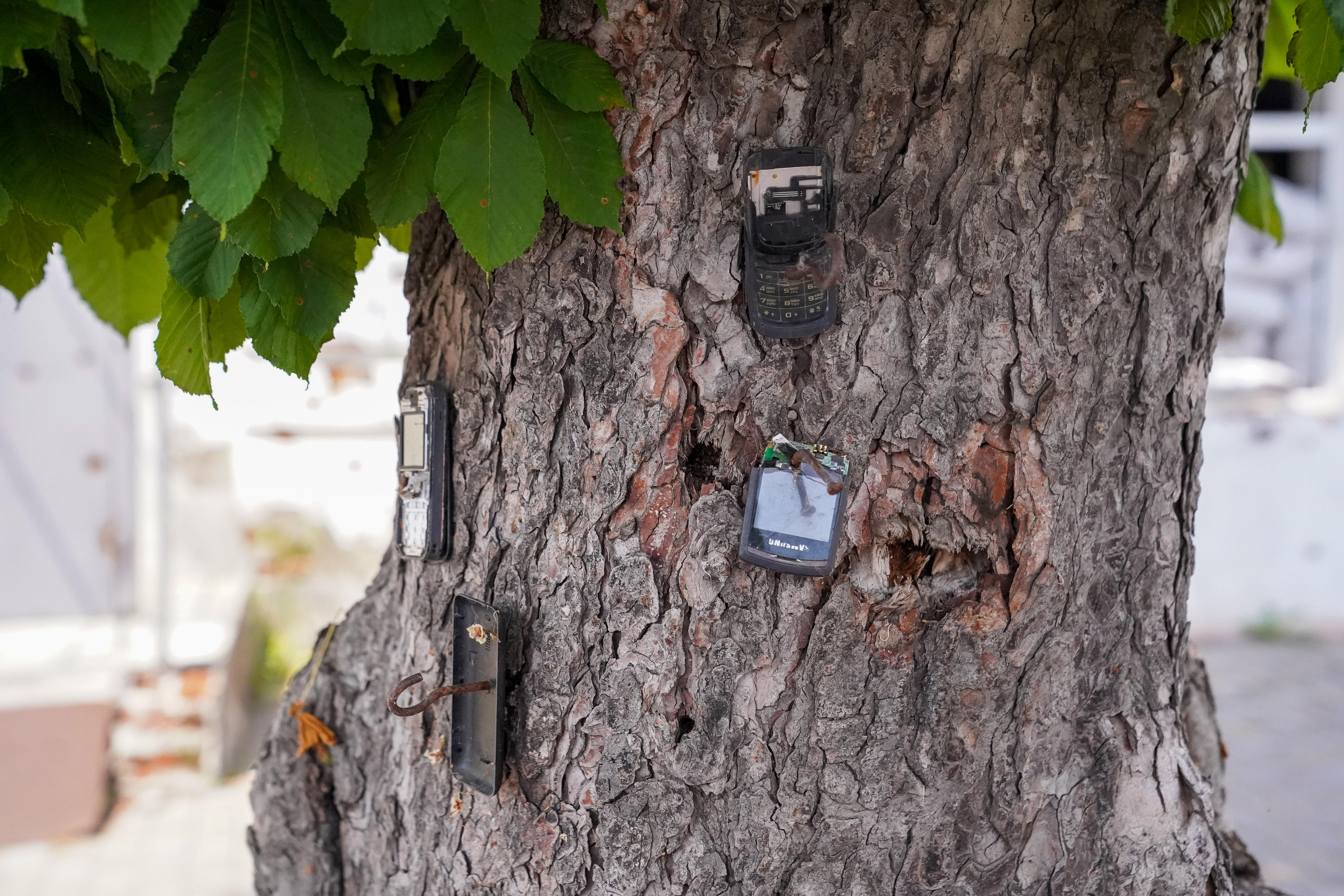 On the main street there are broken mobile phones nailed to one of the trees.