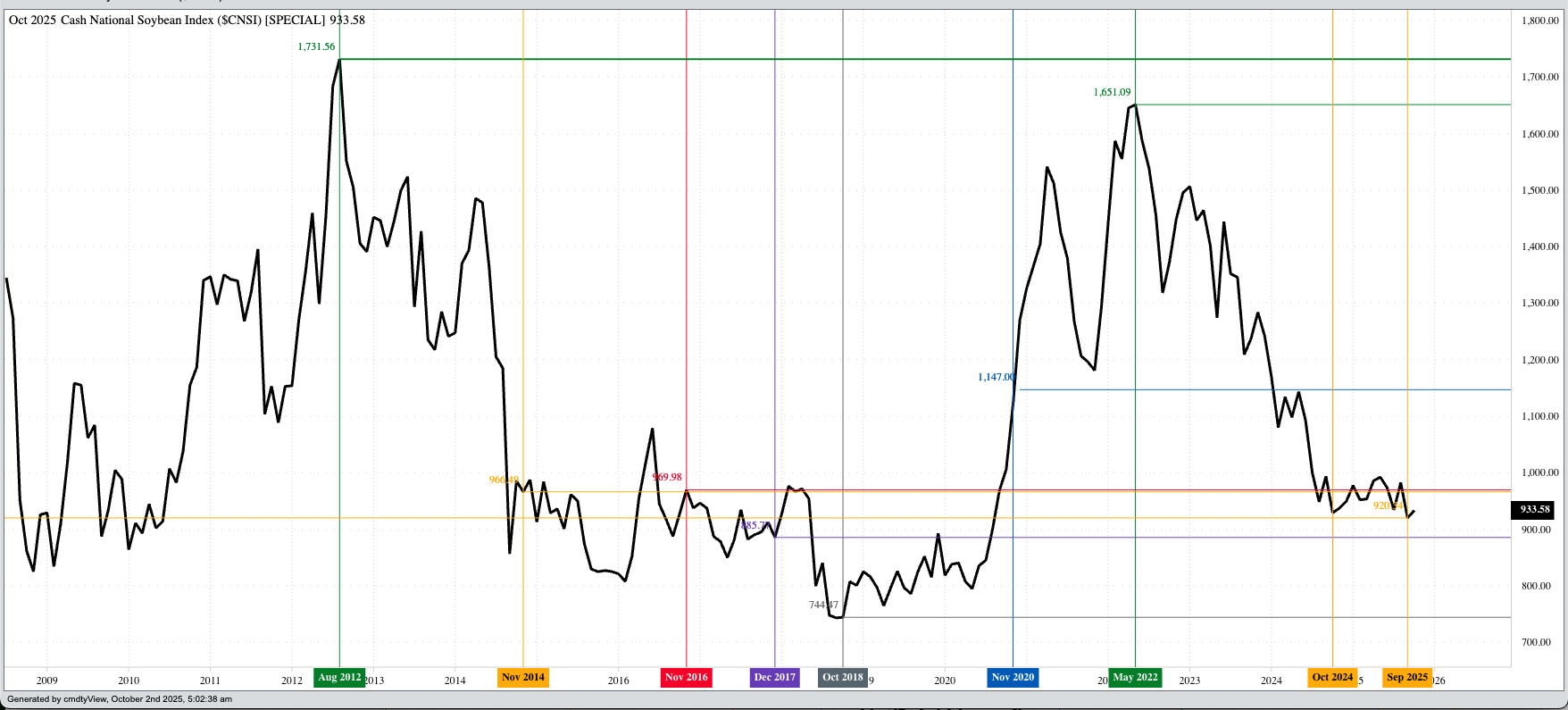 The soybean market was sitting near unchanged at this writing. November (ZSX25) posted an overnight trading range of 6.0 cents, from up 1.5 cents to down 4.5 cents on trade volume of 15,300 contracts. My friend who called Wednesday afternoon also told me he used yesterday’s rally to sell some of his soybeans, knowing that a move created by Watson being triggered by something the US president said would not hold. He later updated me with a message stating merchandisers were weakening basis in his area due to the rally in the futures market. Recall the Nov25 issue closed Wednesday 11.25 cents higher, followed by the National Soybean Index ($CNSI) coming in at $9.3350, up 13.25 cents for the day. I will tell you here and now, this shakes my faith in the Index a bit. We’ve seen this before, though, so I’m willing to give it a couple days to see if this bump in basis holds. Theoretically, it could be argued the world’s largest buyer could see recent developments in the US as an opportunity to get some secondary supplies on the books. First, the Index posted its lowest monthly close since August 2020 and second, with the US government closed there will be no announcements of sales made.