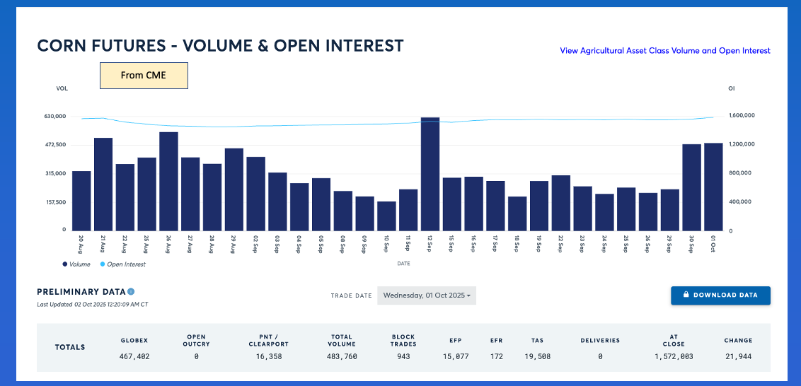 The corn market was quietly higher pre-dawn Thursday morning. The fact I chose to ignore the obvious Wednesday afternoon doesn’t change the reality the corn market uncovered new buying interest as the December issue (ZCZ25) tested $4.10 yesterday. After posting a low of $4.1050, Dec25 extended this little pop to a high of $4.1925 overnight, though trade volume was only 10,500 contracts. But the market is actually more interesting than that. Recall Wednesday finished with the December issue up 1.0 cent. Last night, the National Corn Index ($CNCI) came in at $3.7450, up 1.25 cents from Tuesday meaning merchandisers were pushing cash bids ever so slightly. While basis firmed by 0.25 cent, coming in at 42.0 cents under December futures, the market is still sitting below its previous 5-year low weekly close for this week of 32.75 cents under December. Additionally, Dec25 priced at $4.1650 (Wednesday’s close) put it in the lower 23% of its 5-year price distribution range based on weekly closes only. Recall in yesterday’s Afternoon Commentary I mentioned how trade volume in Dec25 had jumped to 261,500 contracts. The CME is showing open interest in corn increased by 22,000 contracts during the rally. This indicates the move was more than short-covering by Watson.