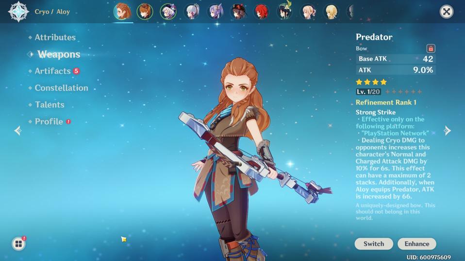 While everyone is going crazy for Baal and Kujou Sara with the launch of Genshin Impact with the launch of Update 2.1 yesterday, there’s one five star hero that players can claim for free. That would be Aloy, of Horizon Zero Dawn fame, who has arrived in Genshin Impact as part of an ongoing deal between miHoYo and Sony. Genshin is still only on PlayStation, not Xbox, after all.