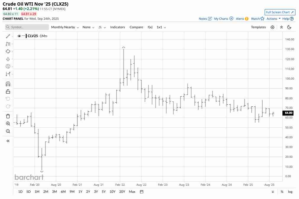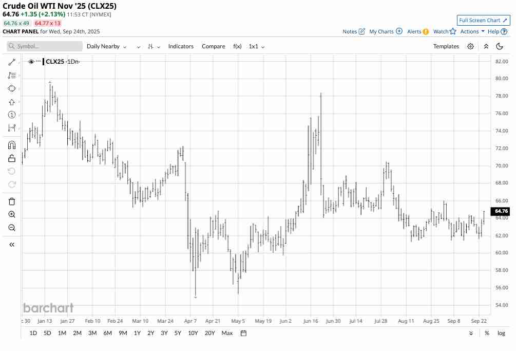The daily year-to-date continuous NYMEX crude oil futures chart illustrates the energy commodity has been in a 2025 range from $55.12 to $79.39 per barrel. At the $64.75 level in September, NYMEX crude oil futures are closer to the bottom end of this year’s trading range.