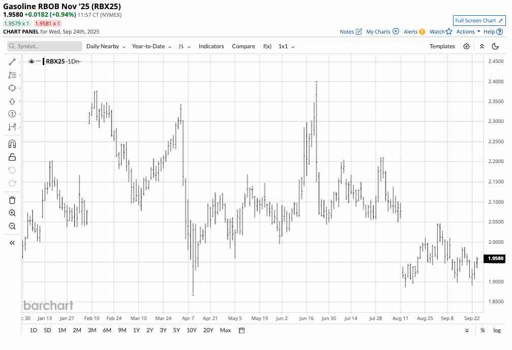 As the 2025 daily chart of NYMEX November gasoline futures illustrates, the price has declined below $2 per gallon in late September as the offseason for demand has started. Technical support is at the April 2025, low of $1.8720 with the first resistance level at the September 2, 2025, high of $2.0466 per gallon wholesale. The trend in gasoline futures is bearish in late September 2025 as the fuel heads into the low-demand season.