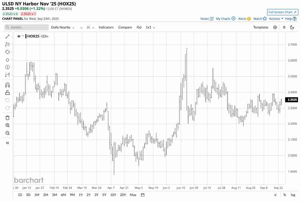 The daily year-to-date chart of NYMEX heating oil futures shows at around $2.35 per gallon in late September, technical support is at the August 18, 2025, low of $2.1862 per gallon, with the first resistance level at the September 17, 2025, high of $2.3933 per gallon wholesale.