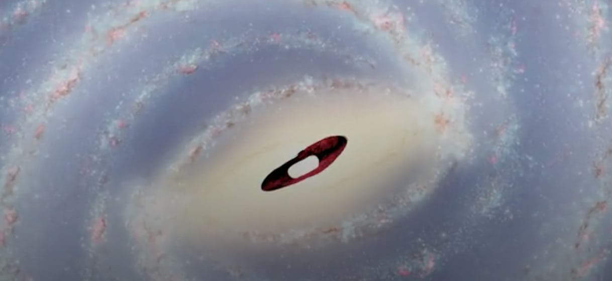 The professor in the University of Wisconsin-Madison's astronomy department, and co-author of a new study, saw a red, tilted structure that pierced through a hole in the dust at the dark center of the galaxy.