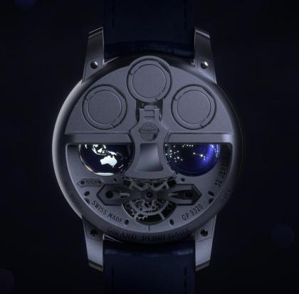 At 3 o'clock, the terrestrial globe is also in titanium and laser-engraved to portray hollow oceans and raised continents. It serves as a day/night indicator while a 24-hour scale provides a GMT reading.