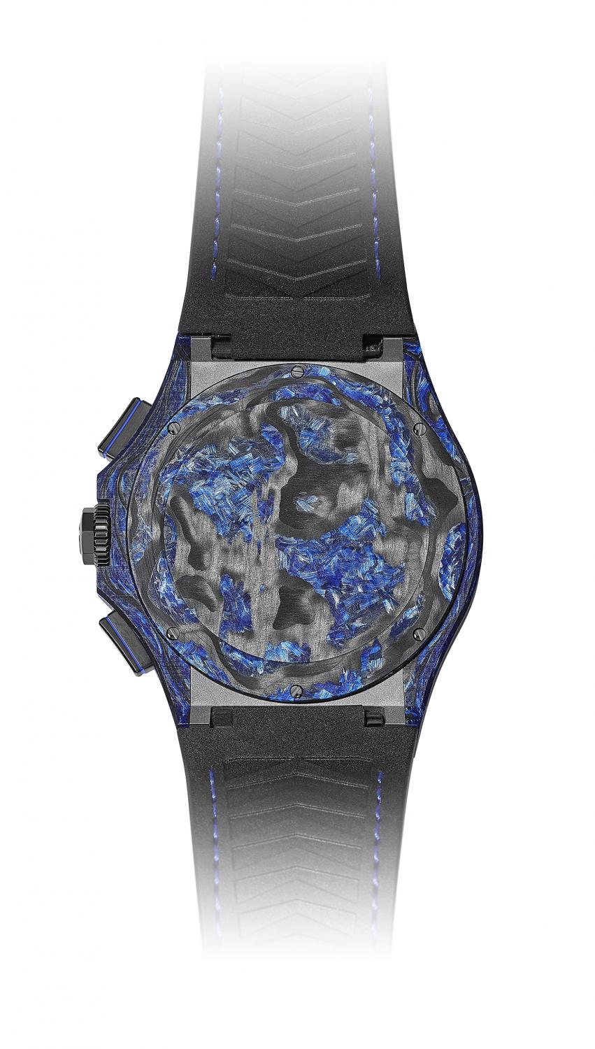 The smooth and uniform surface boasts vibrant touches of blue, achieved by integrating blue glass fibres into the carbon. Other hues or substances such as gold may also be used to give carbon glass a different vibrancy, which will make each watch unique.