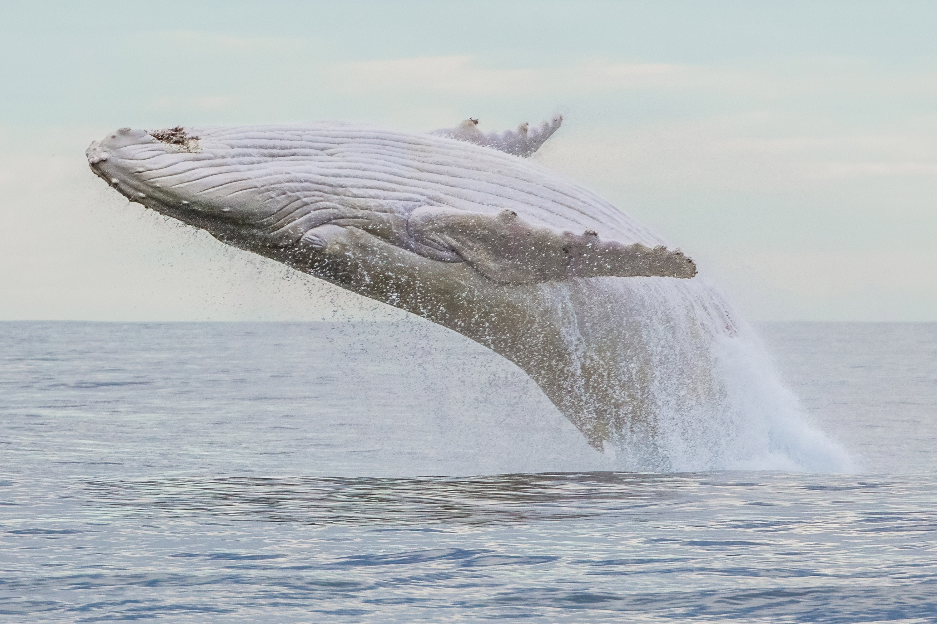 Growing up to the size of a bus, humpbacks have a small dorsal fin on their grey-coloured back, and light-coloured markings under their long pectoral fins, belly and tail.