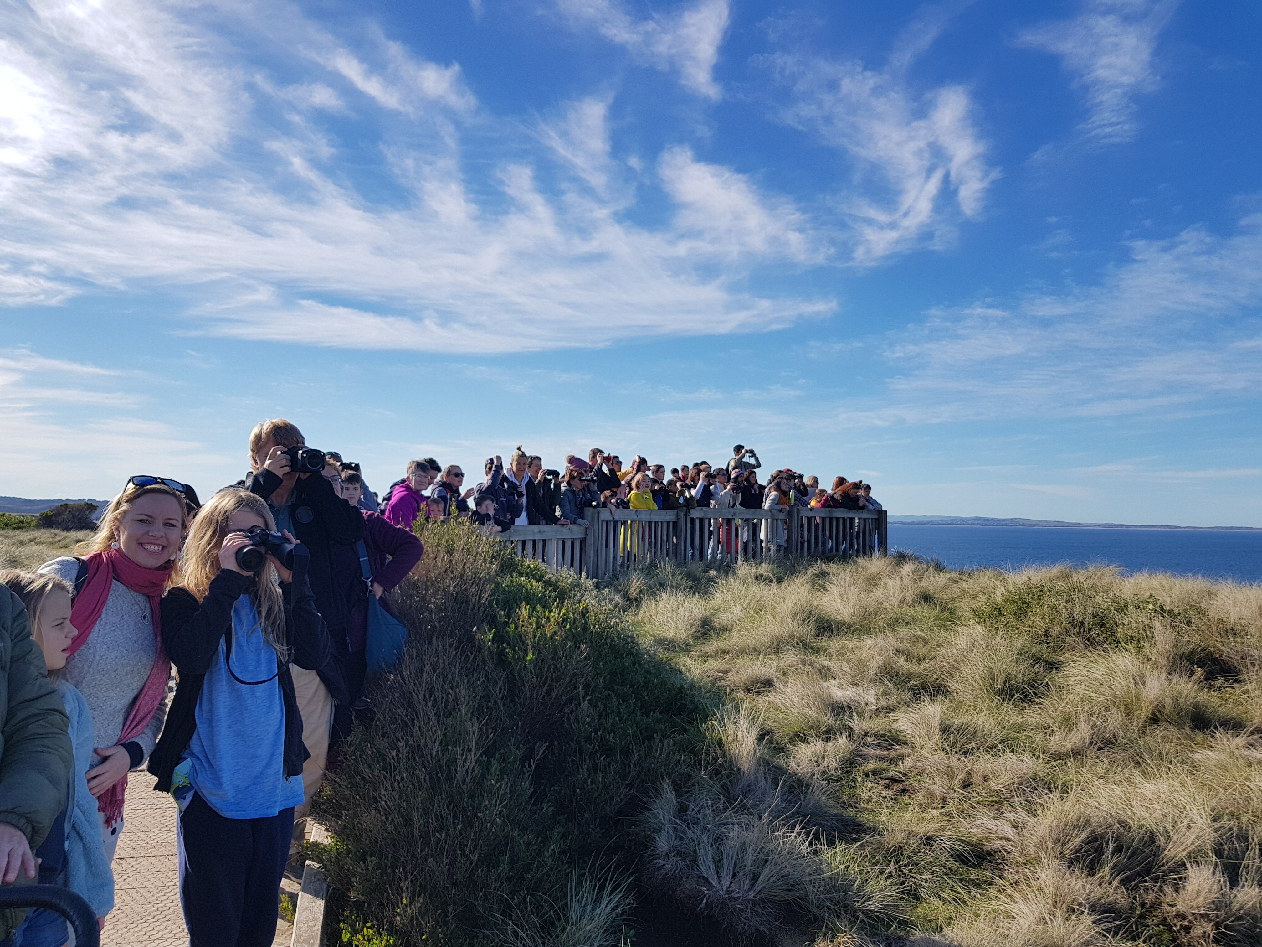 Each year whale watchers and photographers gather on the viewing platform above Logan's Beach to spot whales.