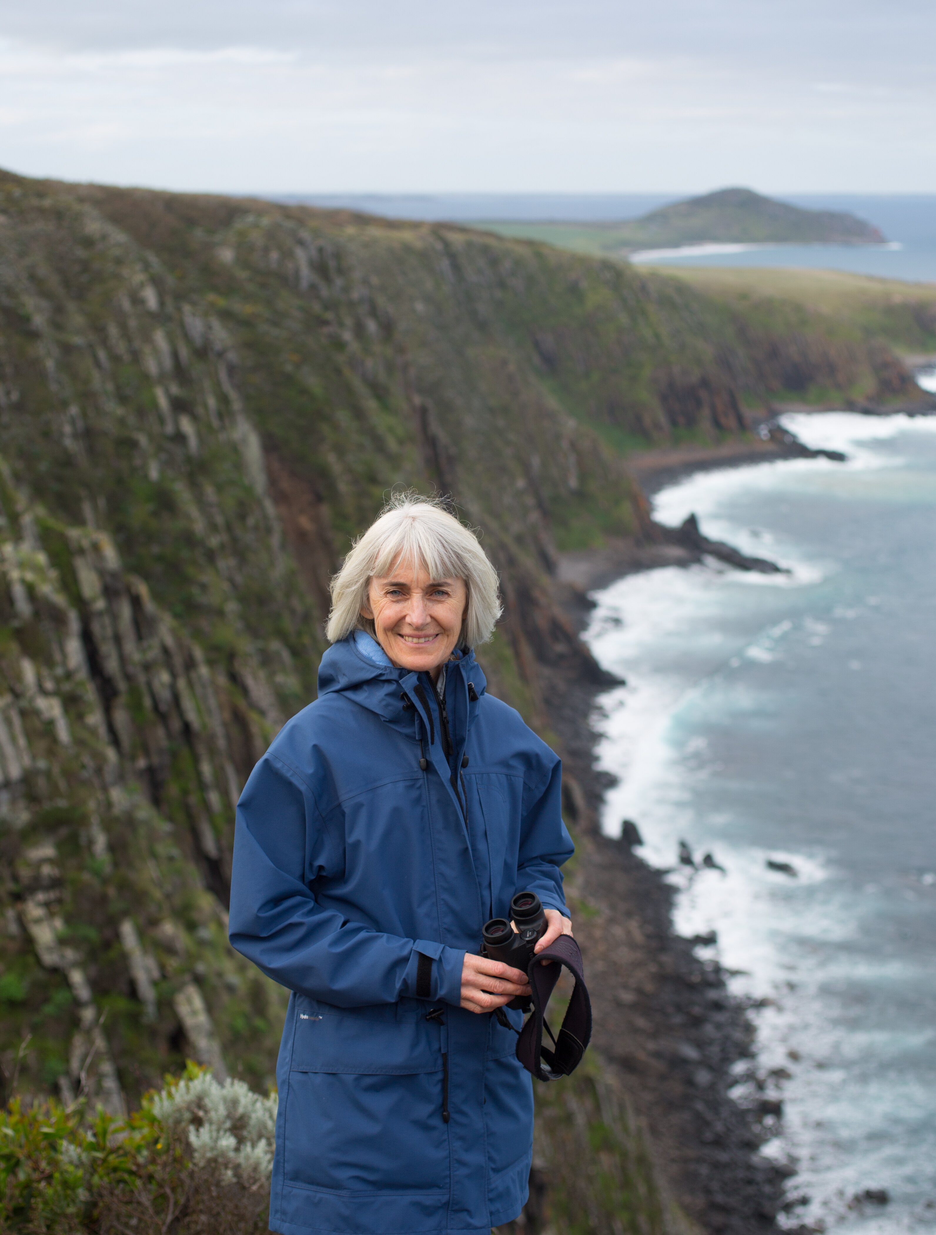 Elizabeth Steele-Collins watches from her vantage point on the Waitpinga Cliffs on the Fleurieu Peninsula as whales come into Encounter Bay.