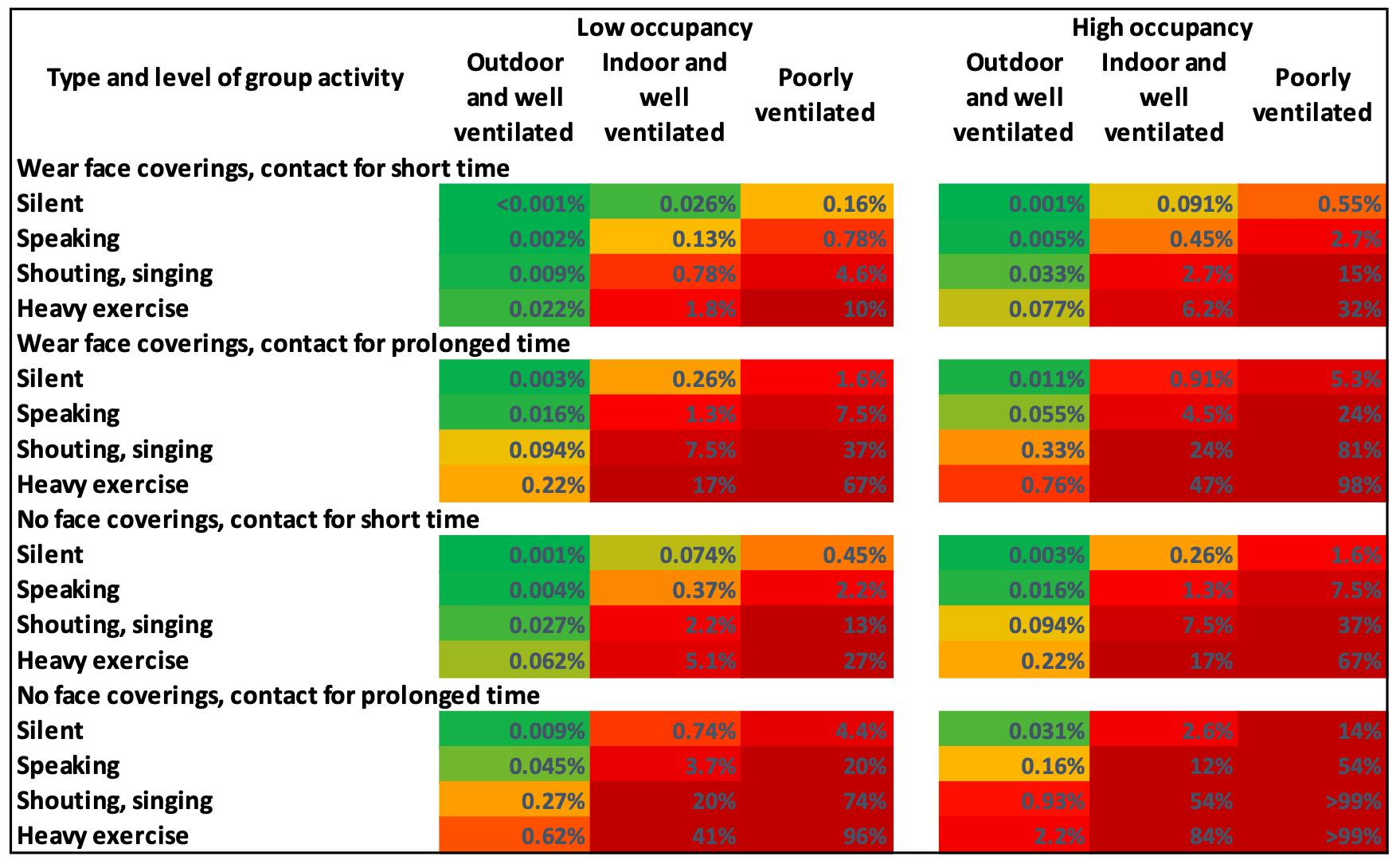 The new chart, adapted from our paper and shown below, gives a percentage likelihood of becoming infected in different situations.