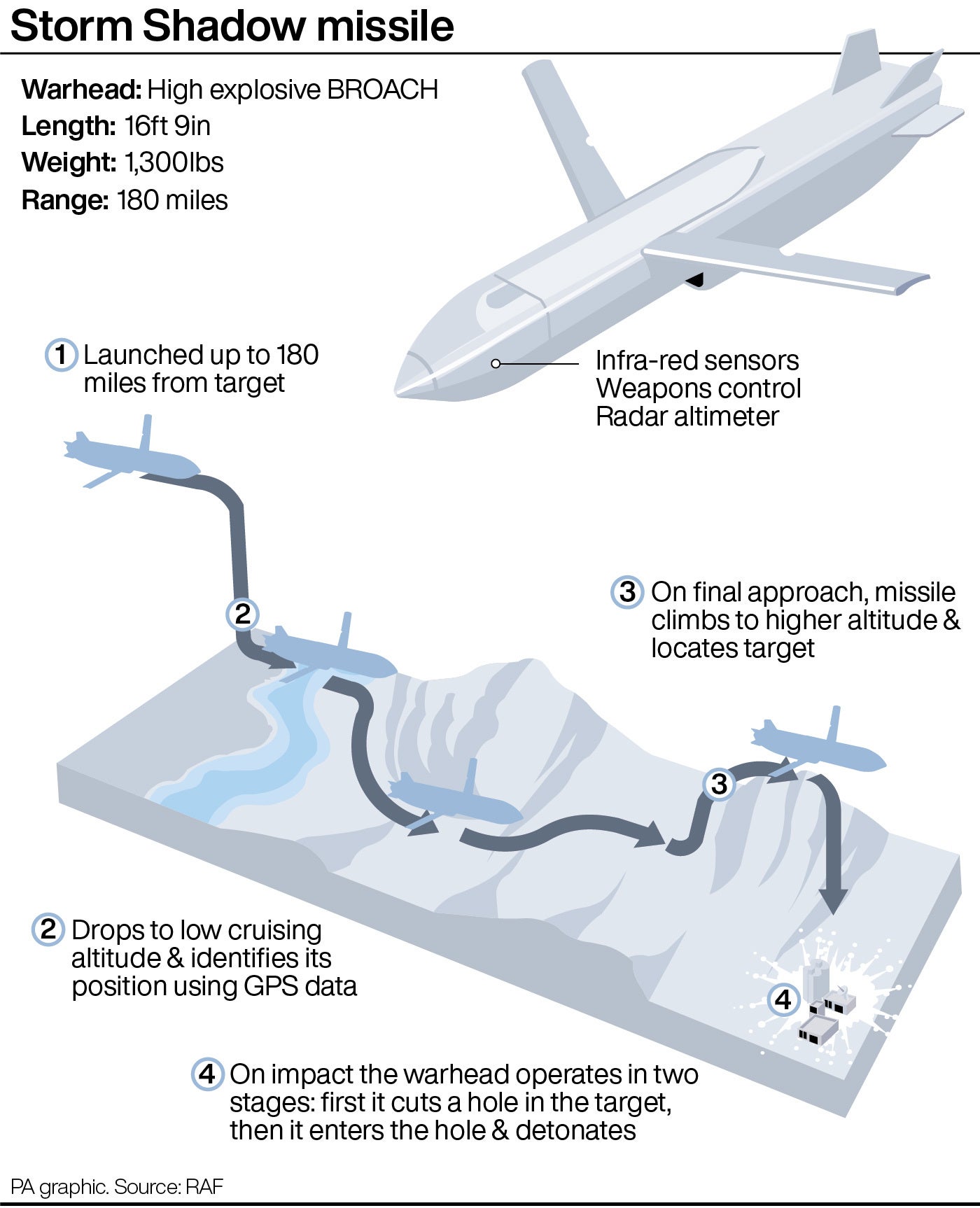 Powered by a turbo-jet engine, the 1,300kg Storm Shadow travels at speeds of more than 600mph, is just over five metres long and has a wingspan of three metres.