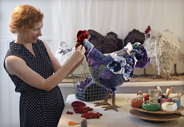 The next step in creating the chicken stools is to hand-stitch the felted or knitted plumage swatches onto the padded eggs. Linville has hired help to do this. She calls them her chickeners.